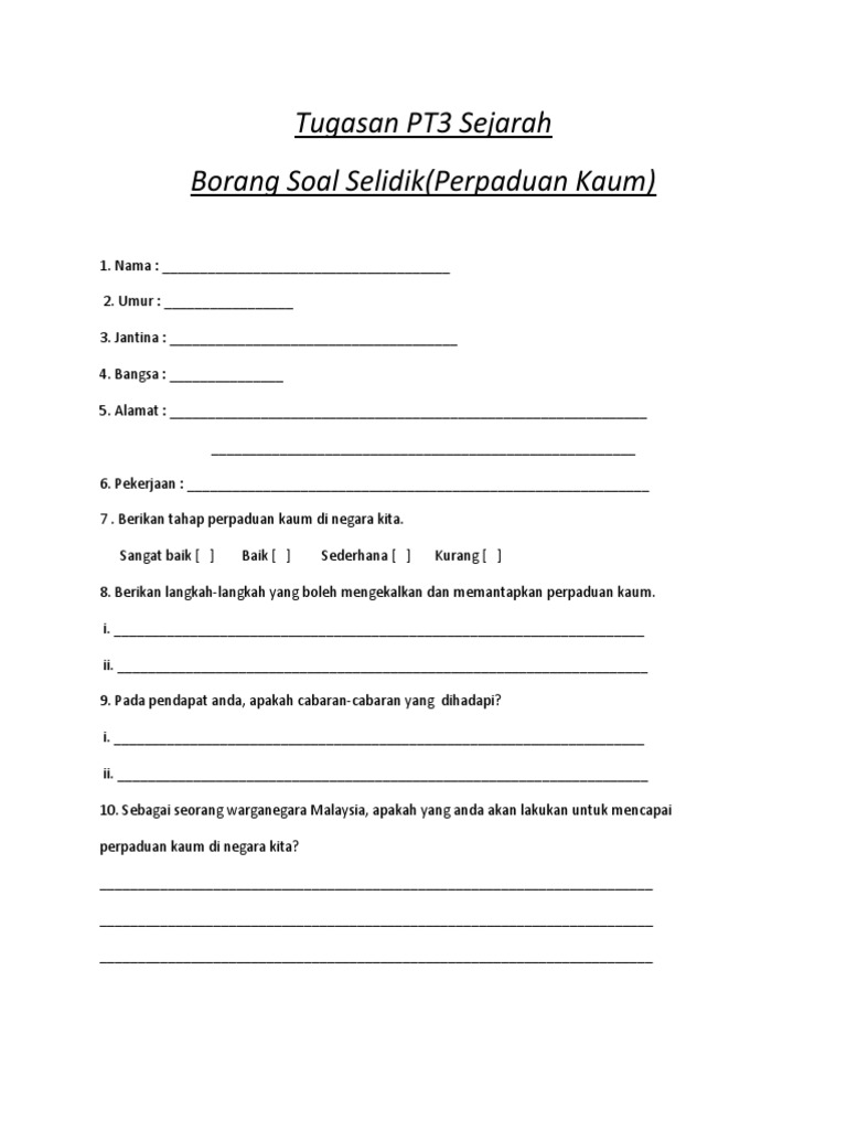 Di bawah ini adalah contoh borang soal selidik sejarah pt3 2019 yang boleh anda jadikan sebagai skrip ketika melakukan temubual kelak. Di bawah ini adalah contoh borang soal selidik sejarah pt3 2016 yang boleh anda jadikan sebagai skrip ketika melakukan temubual kelak. Panduan buat calon pt3 yang sedang membuat satu tugasan kerja kursus geografi pt3 tahun 2018. 10 susunan soalan dalam borang soal selidik 2. Pengaruh guru dalam pencapaian mata. Soalan pendapat di bahagian akhir 4. Borang kaji atau soal selidik ini perlu dibuat dalam perlaksanaan dan disertakan dalam pelaporan tugasan wajib bagi ujian pelbagai instrumen (geografi) pentaksiran tingkatan 3 (pt3) kajian lapangan atau lebih dikenali sebagai kerja kursus, agar menjelaskan lagi hasil dapatan dan maklumat yang. Skema jawapan trial sains komputer, skema jawapan upsr 2016, skema jawapan bm spm 2014, skema jawapan sejarah kertas 3, skema jawapan upsr s. Individu yang membina borang soal selidik ini perlulah berpengetahuan luas agar soalan yang kaedah soal selidik : Iaitu kertas soalselidik dan ujian. Contoh borang soal selidik kerja kursus sejarah stpm. Minat pelajar terhadap mata pelajaran sejarah bahagian d : Borang kaji selidik merupakan borang yang berisi soalan dan juga tersedia ruangan untuk jawapan di mana satu sampel borang yang sama digunakan untuk kesemua responden.