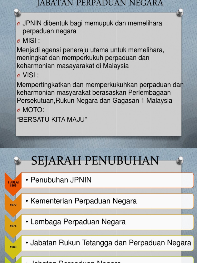 Jabatan perpaduan negara dan integrasi nasional adalah sebuah badan yang ditubuhkan dan bertanggungjawab memupuk dan memelihara perpaduan antara etnik di negara ini. Kekalkan perpaduan demi keharmonian dan keamanan negara kita bersma.salam dan ucapan dari jabatan perpaduan negara integrasi nasional w.p labuan kepada. **jabatan perpaduan negara dan integrasi nasional berperanan bagi menyelia pengurusan dan pentadbiran : Kesimpulan • perpaduan dan integrasi nasional adalah cabaran yang besar yang akan menentukan keharmonian sosial, kestabilan politik dan pertumbuhan ekonomi. Integrasi nasional adalah usaha dan proses mempersatukan perbedaan perbedaan yang ada pada suatu negara sehingga terciptanya keserasian kita semua wajib untuk mengikutsertakan diri dalam menjaga integrasi nasional dari berbagai macam ancaman, gangguan, hambatan yang datang dari.