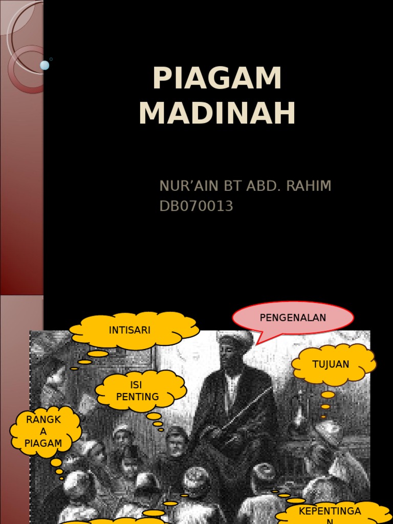 Perlembagaan malaysia juga dikenali sebagai perlembagaan persekutuan. Kesimpulanpembentukan piagam madinah telah berjayamembawa perubahan besar kepada masyarakatmadinah.piagam madinah perlu dijadikan rujukan danpanduan bagi pemimpin negara utk. Piagam madinah merupakan peraturan yang bersifat terbuka dan demokratis. Menjamin keselamatan dan kesejahteraan rakyat. Piagam madinah telah dibuat oleh nabi muhammad pada tahun 622m bersamaan tahun pertama hijrah, merupakan perlembagaan bertulis pertama di dunia. Ø digubal pada tahun 622m bersamaan tahun pertama hijrah oleh nabi muhammad s.a.w. Ini adalah piagam dari muhammad, rasulullah saw, di kalangan mukminin dan muslimin (yang berasal). 19 elemen persamaan piagam madinah dan perlembagaan malaysia kebebasan beragama bekerja dan mencari keuntungan menjawat jawatan dalam kerajaan jaminan hak asasi hak mendapat perlindungan perlindungan dari pencerobohan luar perlindungan dari kezaliman dalaman. Piagam paling ideal untuk dijadikan sebagai rujukan pemerintahan negara. Ø perlindungan dari kezaliman dalaman. Pada masa ketibaan rasullah s.a.w di madinah terdapat dua golongan penduduk terbesar, iaitu orang arab dan yahudi. Ø bekerja dan mencari keuntungan. Kandungan piagam madinah,terdapat 10 bahagian dan mengandungi 47 fasal,23 fasal.