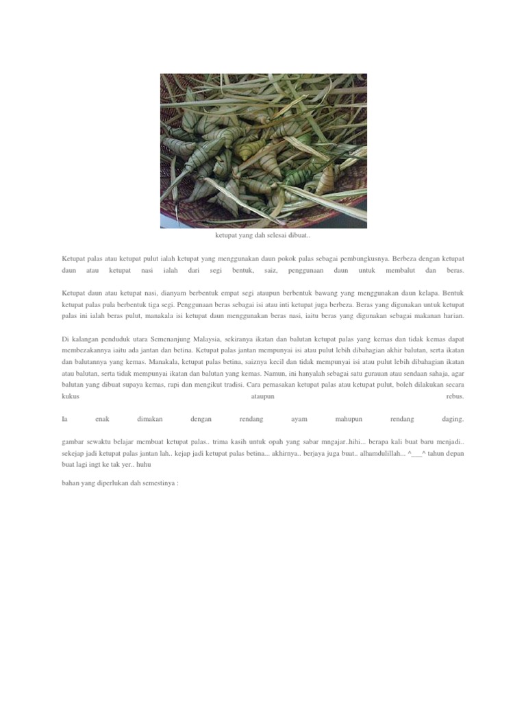 Ia merupakan salah satu rumpai yang perlu dibasmi dalam amalan pertanian diladang atau kebun. Ia berbeza dengan ketupat daun atau nasi dari segi bentuk, saiz, penggunaan daun membalut dan beras pulut. Daun palas seperti daun kelapa. .biasenya daun palas lain hanya akan membeka time ariraye je.tapi,sebaliknya ,kami menjadikannya kerja harian.setiap minggu kami menerime tempahan dari peraih @pembeli. Santan kelapa biasanya hanya boleh tahan beberapa hari jika tidak disimpan dengan betul atau di sejuk bekukan. Pokok palas merupakan tumbuhan yang tergolong kumpulan rumpai. Cara membuat ketupat kelupis daun palas mp3 duration 9:32 size 21.82 mb. Pokok yang mana menurut masyarakat melayu ialah pokok palas. Ketupat palas bahan bahan 1kg beras pulut ( di rendam selam 4 jam) 1kg santan pekat 1 cawan air 1 1/2 sudu kecil garam 2 ikat. Ketupat palas ibu ros 5.966 views3 year ago. Ketinggian pokok adalah seperti dalam gambar.boleh tanam kst tepi2 rumah. Buahnya kecil, tersusun pada tangkainya yang panjang, berwarna hijau ketika muda dan menjadi. Lemang, pucuk daun kelapa dijadikan ketupat nasi, daun palas dijadikan ketupat palas.part 1.